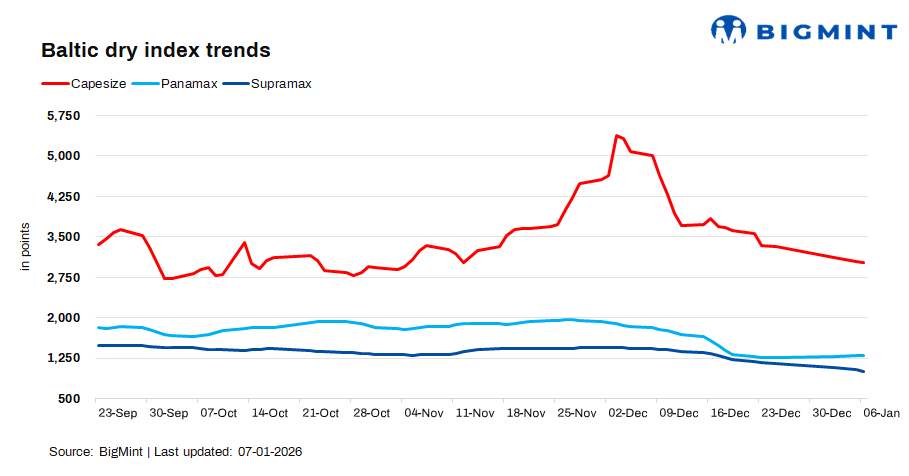 The Baltic dry index declined by 1.13% (21 points) d-o-d to 1,830 on 6 Jan’26. It slipped as weakness in Capesize and Supramax segments outweighed Panamax gains. Softer iron ore demand and ample vessel supply pressured Capesize, while weaker minor bulk cargoes weighed on Supramax.