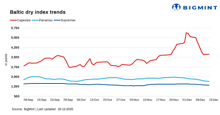 The Baltic dry bulk index dropped by 0.5% (12 points) to 2,193 on 15 Dec against 12 Dec. The index slipped as weaker Panamax and Supramax rates offset a modest Capesize gain, driven by reduced coal and grain fixing, limited minor bulk enquiries, and rising tonnage availability amid a seasonal year-end slowdown.