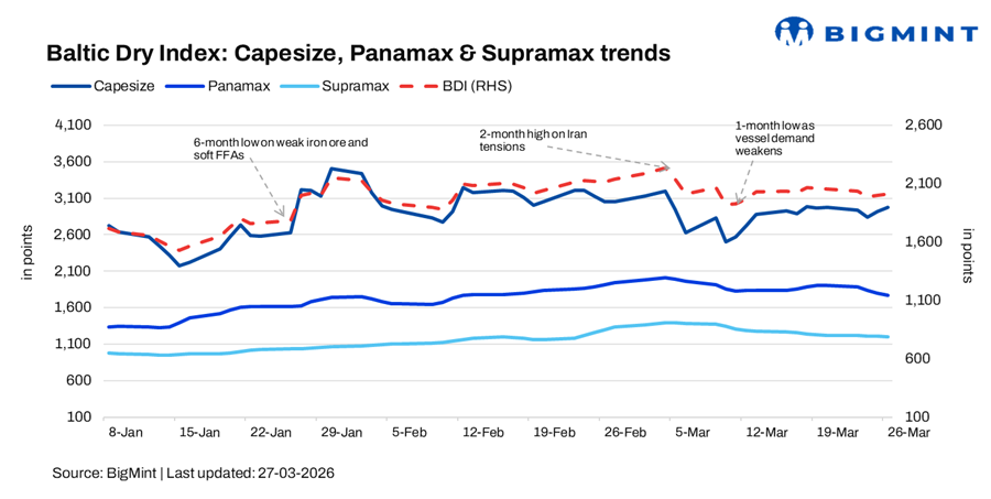 The Baltic Dry Index rose by 0.6% (13 points) d-o-d to 2,014 on 26 Mar’26, supported by firm Capesize demand on active iron ore shipments, while softer coal and minor bulk activity was recorded in Panamax and Supramax segments.