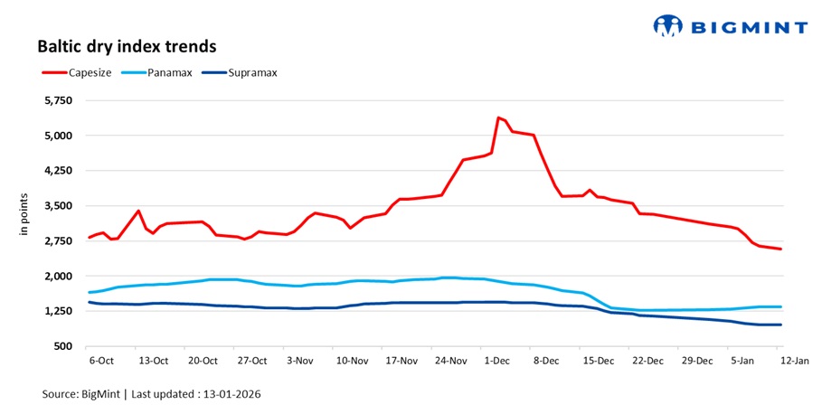 The Baltic dry index fell by 1.7% (29 points) to 1,659 on 12 Jan’26 against 9 Jan. It declined largely driven by softer demand in the Capesize segment. The decline reflects a combination of temporary demand slowdown and cautious chartering activity across major dry bulk routes.