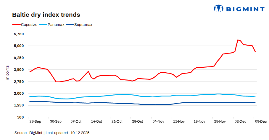 The Baltic dry bulk index fell by 5.1% (137 points) d-o-d to 2,557 on 9 Dec, reflecting soft market sentiment, largely driven by a sharp correction in Capesize rates amid lower iron ore demand from China and rising vessel availability.