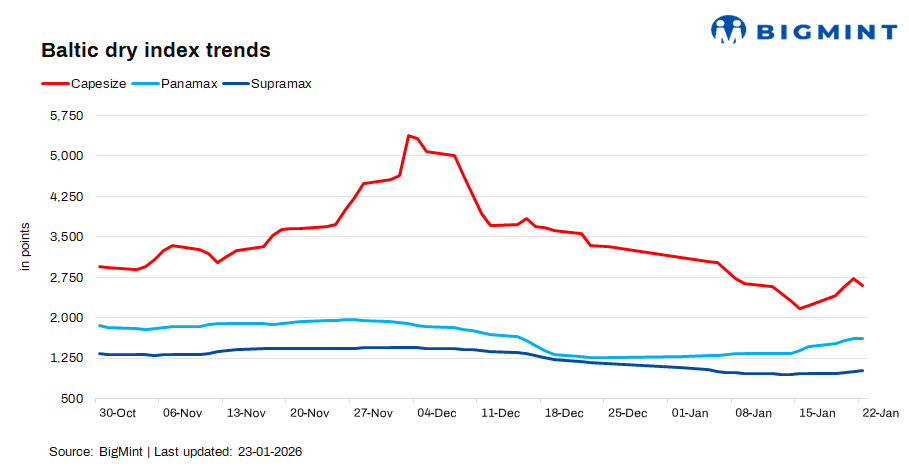The Baltic Dry Index declined by 2.33% (42 points) d-o-d on 22 Jan, pressured mainly by a sharp correction in the Capesize segment, as softer iron ore demand, increased vessel availability, and limited fresh cargo inquiries weighed on sentiment offsetting increase in smaller vessel segments.