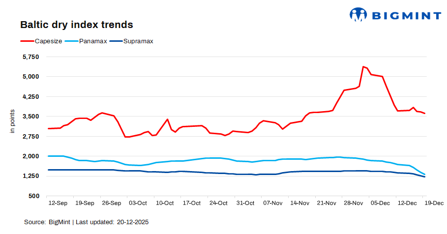 The Baltic dry bulk index fell by 2.3% (48 points) d-o-d to a one-month low of 2,023 on 19 Dec. The index eased as weak coal and grain demand hit Panamax rates, while ample tonnage, slower iron ore fixing, and thin year-end cargo volumes weighed across segments.