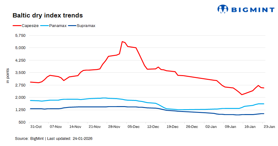 The Baltic Dry Index inched up by 0.1% (1 point) d-o-d to 1,762 points on 23 Jan, driven by stronger Supramax rates, which offset the declines in Capesize and Panamax. While smaller bulk segments witnessed improved demand and tighter vessel availability, chartering sentiment softened for larger ships.