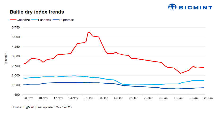 The Baltic Dry Index inched up by 1% (18 points) to 1,780 points on 26 Jan against 23 Jan. Capesize and Supramax gains outweighed stable Panamax rates, reflecting improved demand in key iron ore and minor bulk trades. Stronger cargo flows and better vessel utilisation supported freight sentiment across segments.