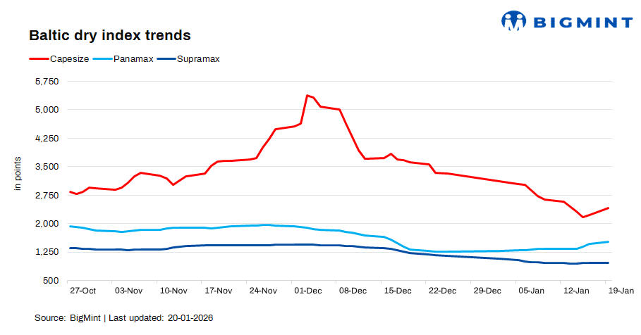 The Baltic Dry Index surged by 5.3% (83 points) to 1,650 on 19 Jan’26 against 16 Jan on improved iron ore and coal demand. Panamax rates also strengthened on steady grain and coal activity, while Supramax remained largely stable, indicating limited momentum in minor bulks.
