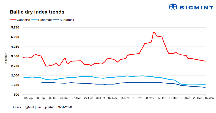 The Baltic dry index inched up by 0.26% to stood at 1,882 on 2 Jan’26 against 24 Dec. The marginal rise in the index was driven by a gradual resumption of chartering activity, with Panamax demand improving on fresh coal and grain enquiries as traders returned to the market.