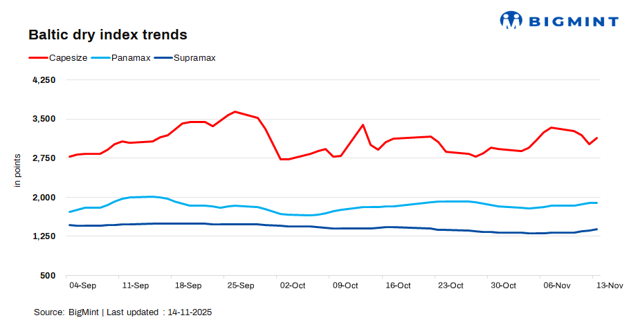 The Baltic Exchange’s dry bulk index increased 47 points d-o-d to 2,077 on 13 Nov’25, on stronger Chinese iron ore demand, tighter vessel availability from seasonal port congestion and delays, steady winter coal shipments, and a bullish tone in physical and FFA markets, with Capesize benefiting the most.