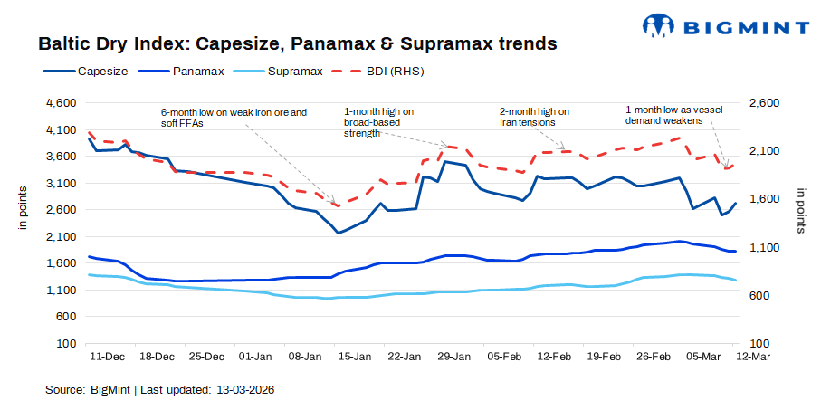 The Baltic Dry Index increased 2.4% d-o-d (46 points) to 1,972 on 12 Mar’26, mainly supported by stronger Capesize freights amid improved iron ore cargo demand and firmer vessel fixtures.