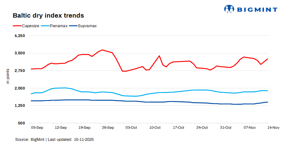 The Baltic Exchange’s dry bulk index increased 48 points d-o-d to 2,125 on 14 Nov’25 amid firmer iron ore fixtures and Chinese mills’ pre-winter restocking. Improved Pacific activity and tighter vessel availability supported rates, while Panamax remained stable and Supramax inched up on steady grains and coal demand.