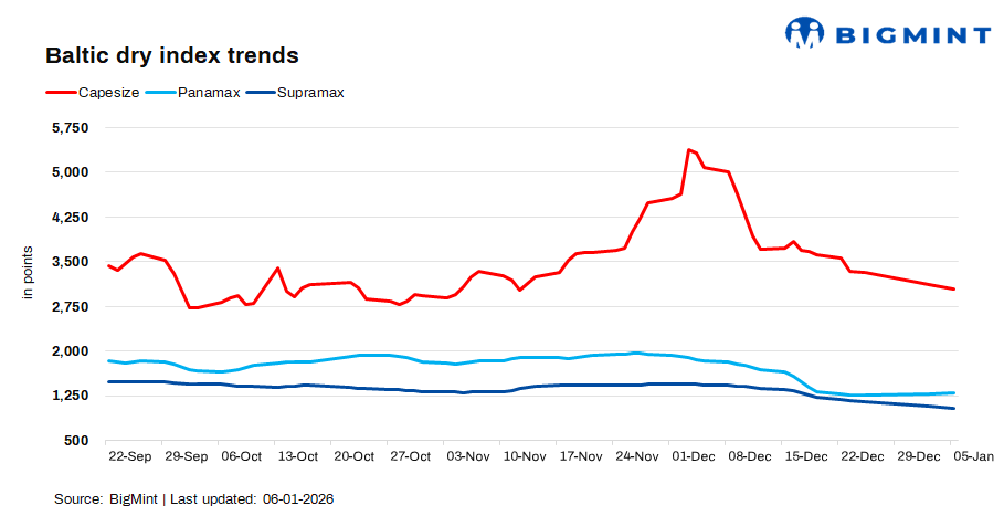 The Baltic dry index declined by 1.65% to 1,851 on 5 Jan’26 against 2 Jan. It declined due to weaker Capesize and Supramax performances, as softer iron ore, coal, and minor bulk cargo demand, combined with adequate vessel supply and limited post-holiday activity, weighed on freight rates.