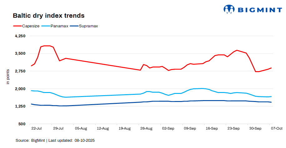 The Baltic Exchange’s dry bulk index edged up by 15 points d-o-d on 7 Oct’25 to 1,947 points. Capesize and Panamax rates rose on stronger vessel demand and firmer fixtures, while Supramax fell amid limited cargo activity and oversupply.