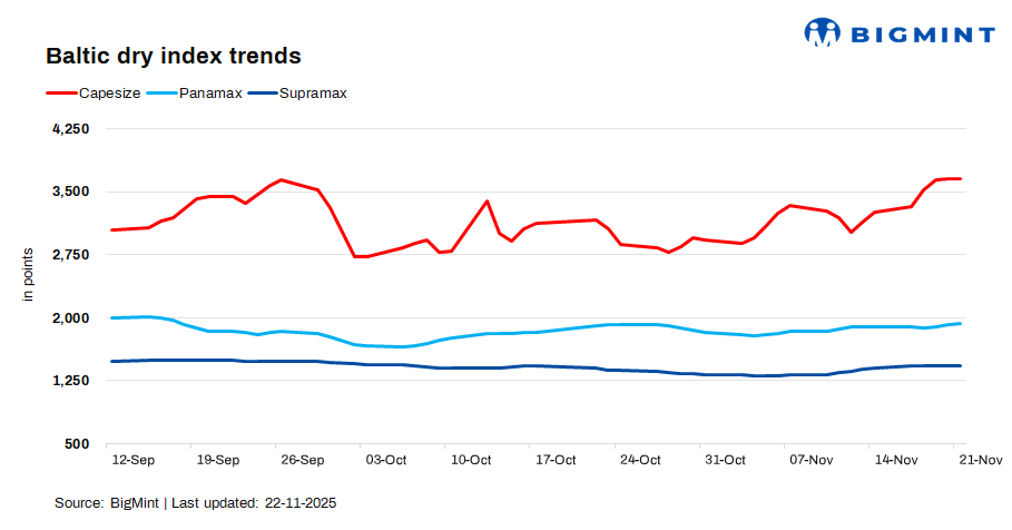 The Baltic Exchange’s dry bulk index gained 5 points d-o-d to nearly a two-year high of 2,275 on 21 Nov’25. This was driven by stronger iron ore fixtures, boosting Capesize demand, and steady grain and coal cargo flows, supporting Panamax rates, while balanced supply kept Supramax levels firm.