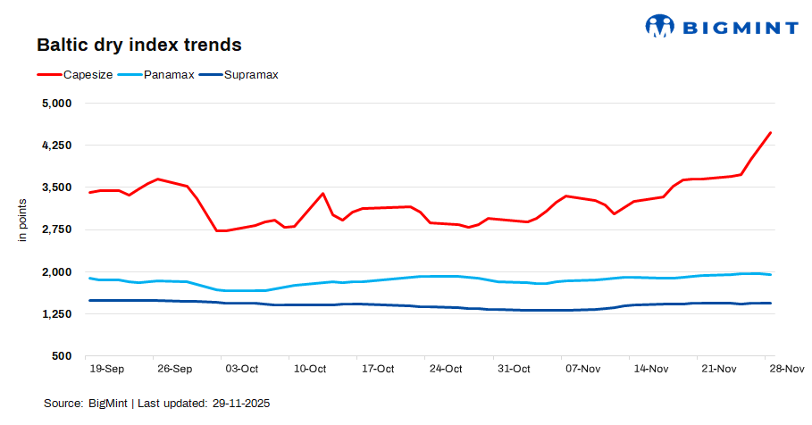 The Baltic dry bulk index surged by 80 points d-o-d to 2,560 on 28 Nov’25, due to a strong Capesize rally, driven by firmer iron ore demand and tighter vessel supply. Panamax dipped on softer grain demand, and Supramax edged up on steady minor bulk flows.