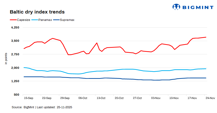 The Baltic Exchange’s dry bulk index increased 20 points to 2,295 on 24 Nov’25 against 21 Nov. Capesize rates strengthened on firm iron ore demand and tighter vessel supply amid Chinese winter restocking. Panamax gained slightly on steady grain and coal demand, and Supramax remained stable with balanced activity.