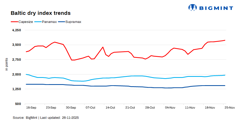 The Baltic Exchange’s dry bulk index increased d-o-d by 14 points to 2,309 on 25 Nov’25. The index inched up on firm capesize demand – driven by active iron ore chartering and tight tonnage – lifted overall sentiment, while steady grain and coal inquiry supported panamax rates.