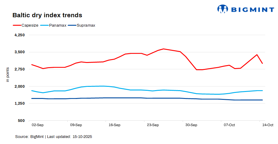 The Baltic Exchange’s dry bulk index decreased by 122 points d-o-d to 2,022 on 14 Oct’25. The index declined as Capesize rates weakened, weighed down by slower iron ore shipments from major exporters and an increase in vessel availability.