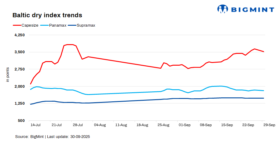 The Baltic Exchange’s dry bulk index slipped on 29 Sept’25 as compared to 26 Sept, on declining vessel rates, weak steel demand, and growing inventories at Chinese ports.