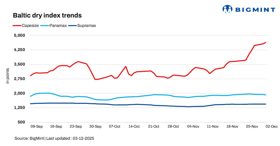 The Baltic dry bulk index rose by 0.7% (17 points) d-o-d to 2,600 on 02 Dec. Capesize gained on improved chartering interest, Panamax slipped amid weaker grain and coal activity, while Supramax stayed steady on balanced demand and supply. Iron ore futures also edged up as infrastructure demand and solid steel consumption helped offset weak economic data from China.
