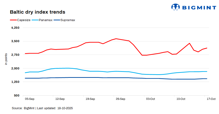 The Baltic Exchange’s dry bulk index rose 23 points d-o-d to 2,069 on 17 Oct’25. The climb was driven by stronger rates across all vessel segments, amid tightening vessel supply and steady demand for major bulk commodities such as iron ore and coal.