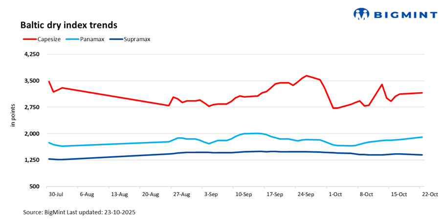 The Baltic Exchange’s dry bulk index rose by 23 points on 22 Oct’25 to 2,092 against 17 Oct. The index rise was driven by the larger vessels amid increased iron ore shipments from Australia and Brazil driven by seasonal restocking by Chinese steel mills ahead of winter.