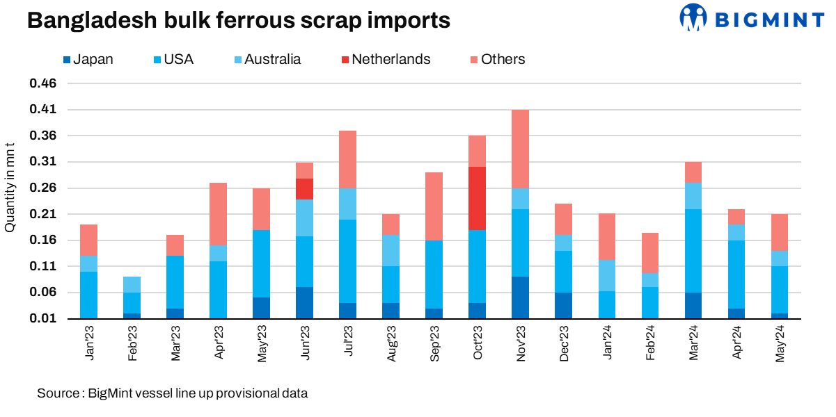 Bangladesh’s bulk ferrous scrap imports stood at 210,010 t in May’24, down by 6% in comparison with 223,991 t in Apr’24. Similarly, on y-o-y, imports registered a fall of 18% as against 255,196 t seen in May’23. The US remained the leading exporter of scrap at 92,524 t, followed by New Zealand at 52,290 t and Australia at 26,887 t. In Jan-Apr’24, scrap imports aggregated to 1,130,071 t.