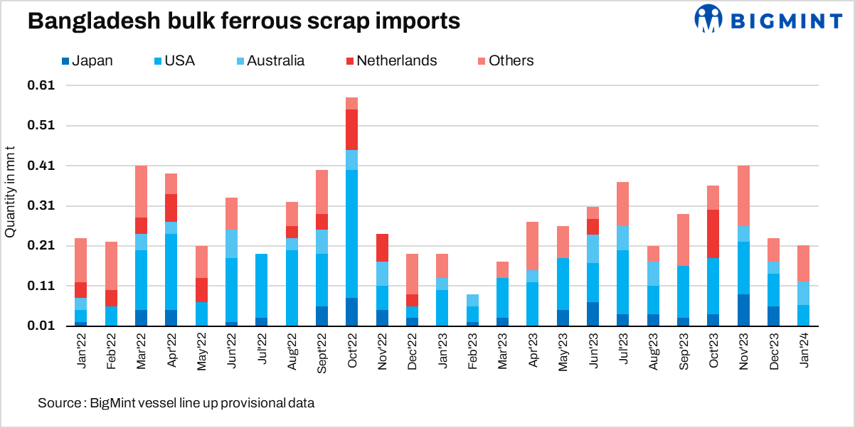 - Imports from Japan largely absent: Another prominent high-grade scrap supplier, Japan, also recorded no major volume as scrap exports to Bangladesh because of lesser involvement in major buying apart from the Kanto tender for January 2024. The increased demand from other buyers, like Vietnam and Taiwan, kept the market competitive for Bangladesh.