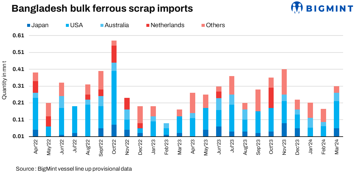 Imports from Australia nearly doubled: Bangladeshi importers procured approximately 48,685 t of ferrous scrap from Australia in March, reflecting a notable surge of 82% compared to the 26,804 tonnes imported in February. Interestingly, there were no imports recorded in March 2023.