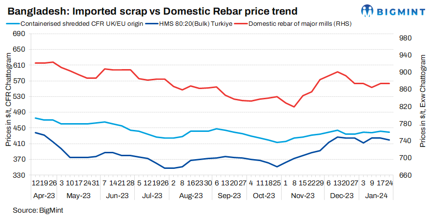 Domestic market: In the local market, HMS (90:10) quality scrap prices were evaluated at BDT 62,000/t, while PNS quality scraps stood at BDT 64,000/t. An official from a steel mill noted, “Local scrap prices have increased over the week due to shortages in the domestic market, compounded by issues with letters of credit (LC) approvals.”