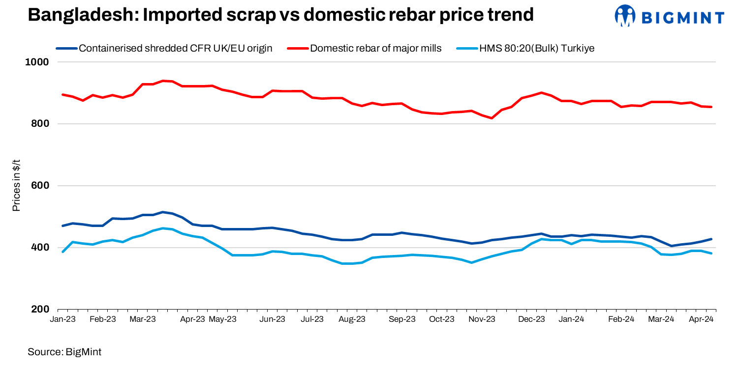 BigMint’s weekly assessment for US-origin HMS (80:20) bulk scrap prices witnessed a $3/t hike w-o-w to $400/t CFR Chattogram.