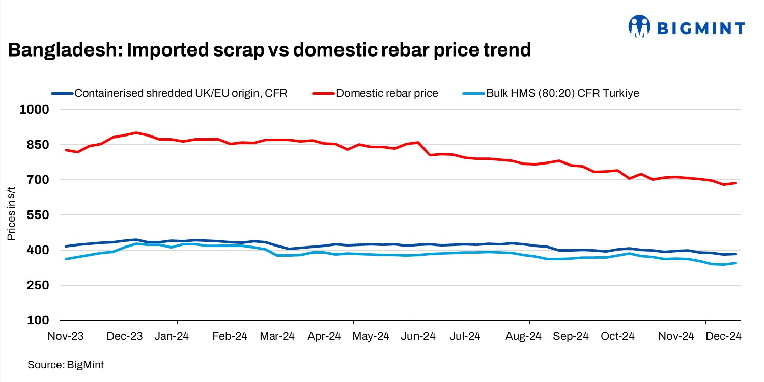 Rebar sales in Dhaka and Chattogram remained sluggish despite ongoing discounts. Additionally, steel producers have reduced prices by nearly BDT 7,500-8,000/t ($63-67/t) since the beginning of the month in an effort to clear out inventory and cover operating costs. However, inquiries for scrap remained low despite the fall in rebar tags.