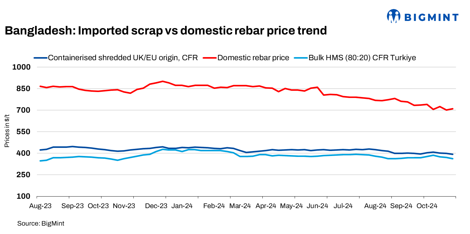 Bangladesh’s imported ferrous scrap prices continued to decline by up to $8/t w-o-w with subdued buying interest among market participants.