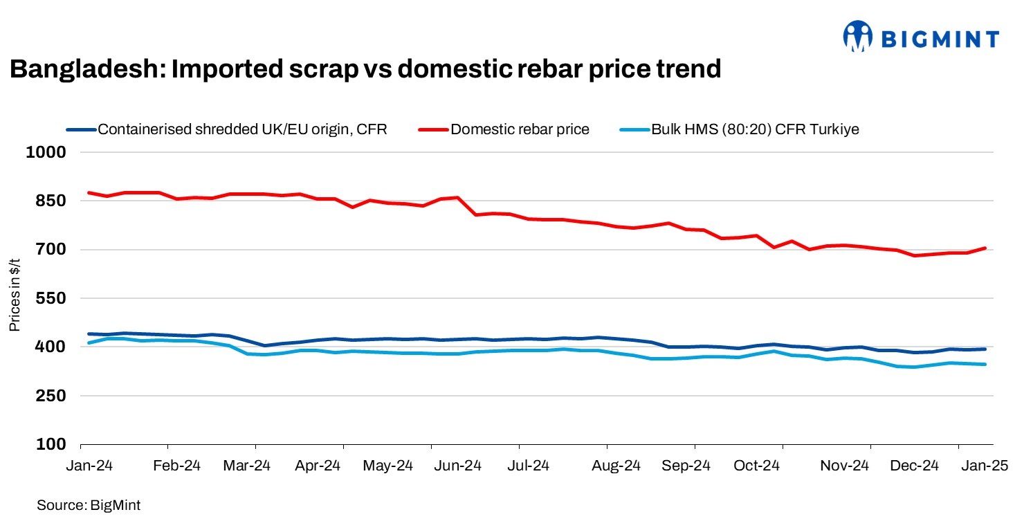 Bangladesh’s imported scrap prices witnessed a mixed trend over the past week. Imported containerised scrap prices saw a slight increase of $2-3/tonne (t) w-o-w. For bulk scrap, inquiries remained sluggish, and buyers continued to keep their bids low, resulting in a $4-6/t w-o-w price decrease, particularly for scrap from Japan and the US.