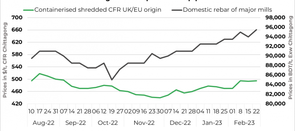 SteelMint assessed domestic rebar prices at BDT 96,000/t ($898/t) exw-Chittagong, up by BDT 1,000/t. Following suit, mills in Dhaka increased their rebar offers by BDT 1,000-2,000/t w-o-w. Fresh offers are now at BDT 91,000-92,000/t ($851-859/t).