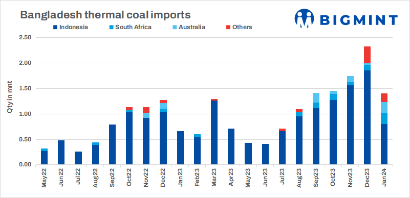 Bangladesh’s thermal coal imports were recorded at 1.40 mnt in Jan’24, dropped by 40% m-o-m compared to 2.32 mnt in Dec’23. Indonesia was the largest exporter at 0.80 mnt (dropped by 57% m-o-m) in Jan’24 as against 1.85 mnt in Dec’23, followed by South Africa at 0.22 mnt in Jan’24 compared to 0.11 mnt in Dec’23. Shipments to the US stood at 0.06 mnt in the month under review.