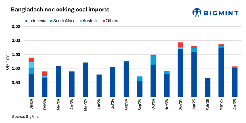 Bangladesh’s thermal coal imports stood at 1.08 mnt in Apr’25, registering a sharp 43% drop from 1.87 mnt in March. Imports rose by 20.6% y-o-y, compared to 0.90 mnt in Apr’24. Indonesia accounted for 95% share of Bangladesh’s non-coking coal imports and remained the top supplier by shipping 1.03 mnt in Apr.