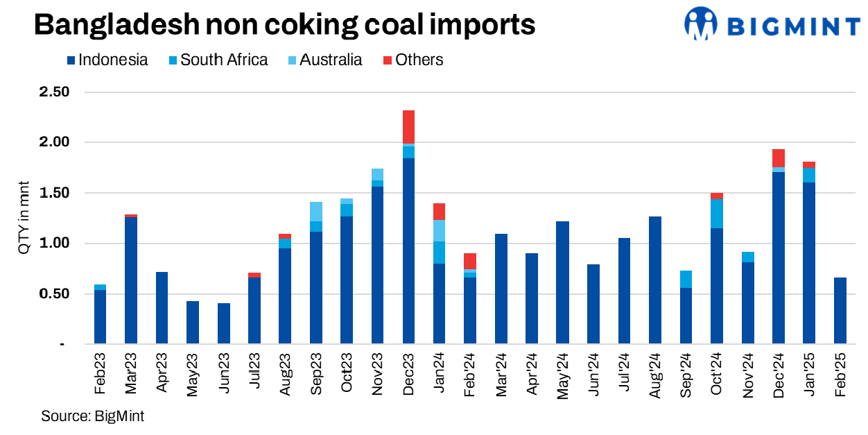 Bangladesh’s thermal coal imports stood at 0.66 mnt in Feb’25, registering a sharp 63.5% decline from 1.81 mnt in Jan’25. On a y-o-y basis, imports fell by 7% compared to 0.71 mnt in Feb’24. The decline points to fluctuating demand-supply dynamics in the market.