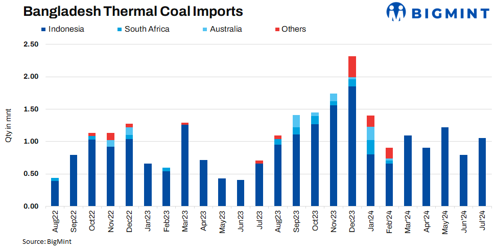 - Bangladesh’s thermal coal import volumes rose significantly by 34% m-o-m to 1.05 mnt in Jul’24 compared to 0.79 mnt in Jun’24, as per Customs data.