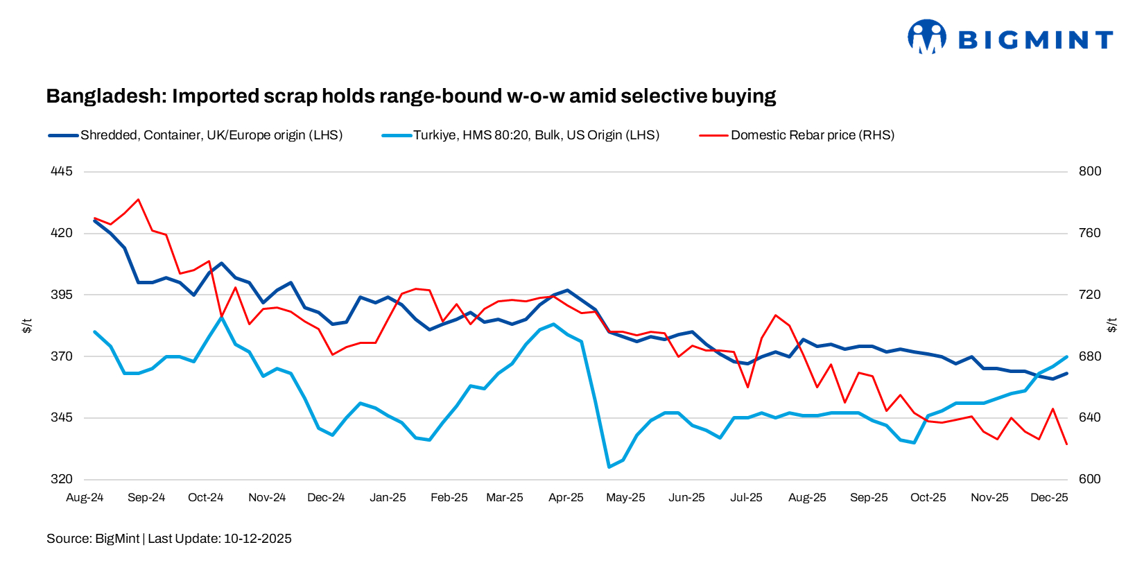 In the domestic market, billet prices were heard at BDT 63,000/t ($516/t), while rebar traded at BDT 72,000-76,000/t ($589-622/t) in Dhaka and Chattogram. Local scrap was assessed at BDT 45,000-46,000/t ($368-376/t).