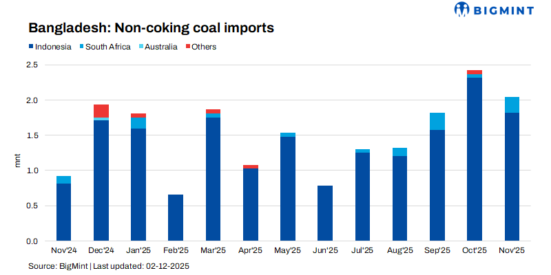 Bangladesh imported 2.04 mnt of non-coking coal in Nov’25, marking a notable 16% drop from Oct’s 2.42 mnt. Despite the monthly decline, overall intake surged 122% y-o-y from 0.92 mnt in Nov’24, reflecting a sharp rebound in demand. Indonesia continued as the country’s primary supplier with 1.82 mnt though this was 21% lower m-o-m while South Africa contributed 0.22 mnt during the period.
