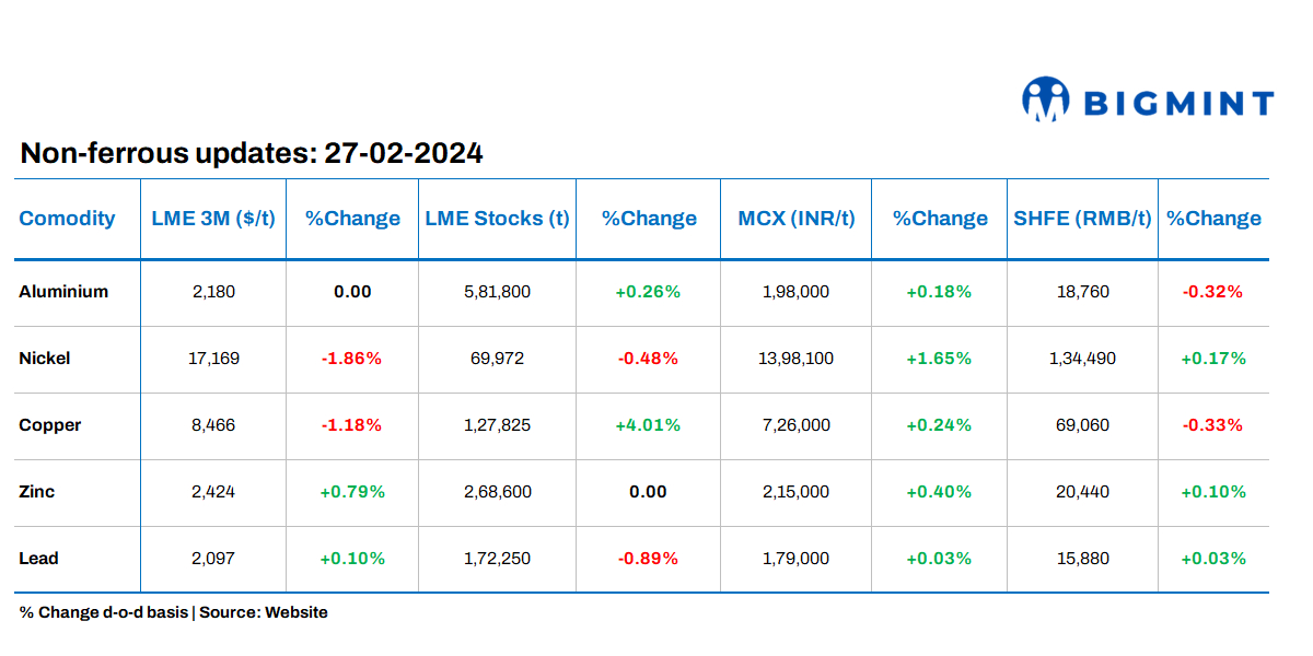 Three-month aluminium futures remained stable at $2,180/tonne (t), nickel prices were at $17,169/t (down 1.8%), copper prices settled at $8,466/t (down 1.1%), zinc edged up by 0.7% to $2,424/t, and lead prices gained by 0.1% to $2,097/t.