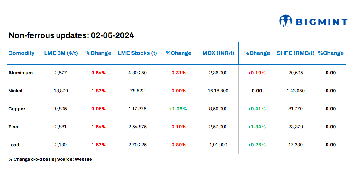 Base metals prices on LME witnessed downtrends at yesterday’s closing with the highest drop seen in nickel. Meanwhile, India’s domestic market also saw slight drop in prices yesterday. India’s manufacturing growth slightly slowed in April but remained strong due to robust demand, prompting increased raw material purchases. LME mandated aluminium producers to submit emissions data by March 2025, aligning with Europe’s CBAM.