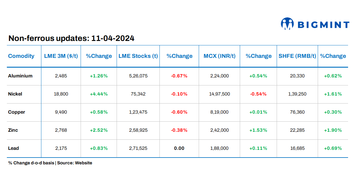 Base metals prices traded on the London Metal Exchange (LME) remained positive on Wednesday’s closing, 10 April, with the highest gain seen in nickel prices. Meanwhile, stocks at LME registered warehouses witnessed outflows.