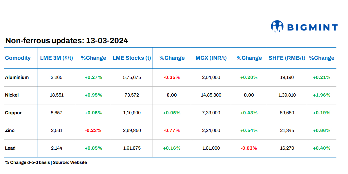 Base metals prices on the London Metal Exchange (LME) were up across the board barring zinc at the 5pm close of trading on Tuesday 12 March despite the strengthening of the dollar. Meanwhile, stocks at the LME registered warehouses witnessed varied trends.