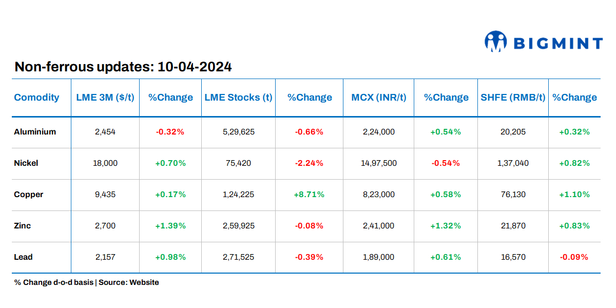 Base metals traded on the London Metal Exchange (LME) remained resilient on Tuesday’s closing, 9 April, benefiting from a relatively steady macroeconomic environment. This stability came ahead of significant events such as the European Central Bank meeting and the release of the US Consumer Price Index report later in the week.