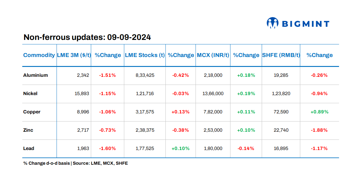 Base metals prices on the London Metal Exchange (LME) mostly exhibited negative trends, with lead witnessing the largest decline by 1.6%. Meanwhile, metal stocks at LME-registered warehouses showed negative movements.