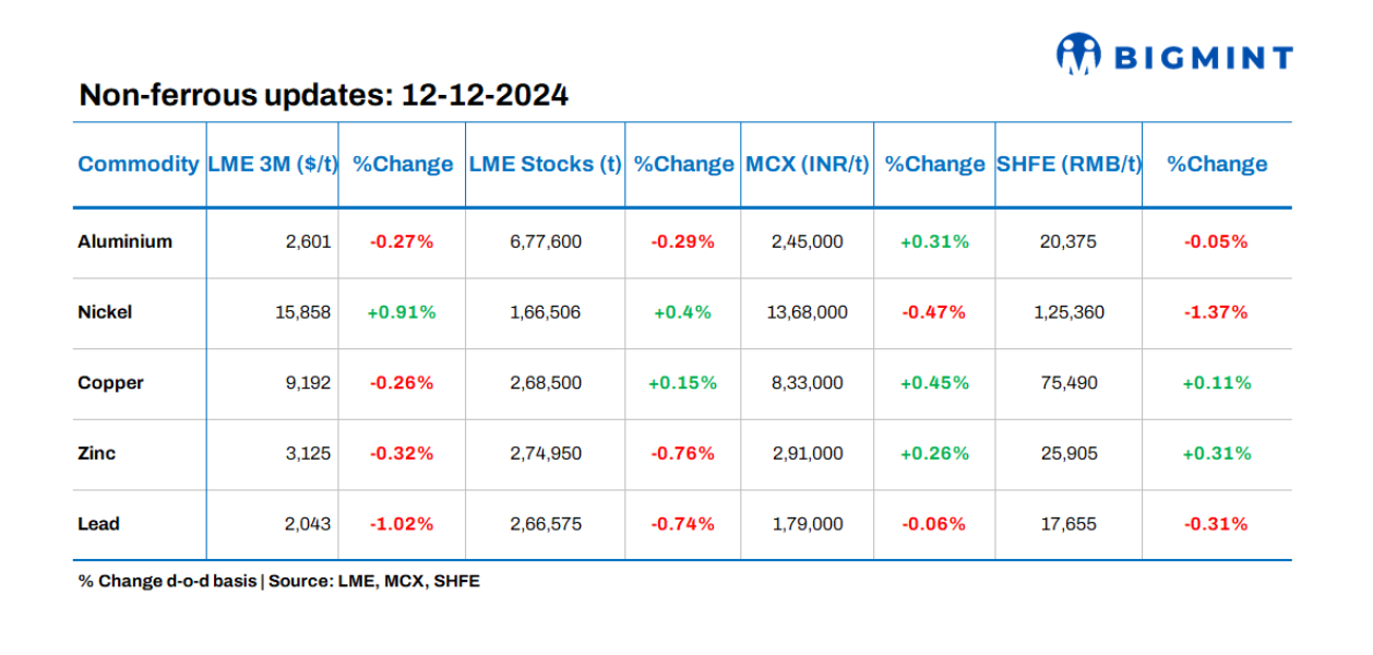 Base metals prices on the London Metal Exchange (LME) showed negative trends, except for nickel, which increased by 0.91% d-o-d. Meanwhile, inventories at LME-registered warehouses witnessed mixed movements, with zinc stocks decreasing by 0.76% d-o-d.