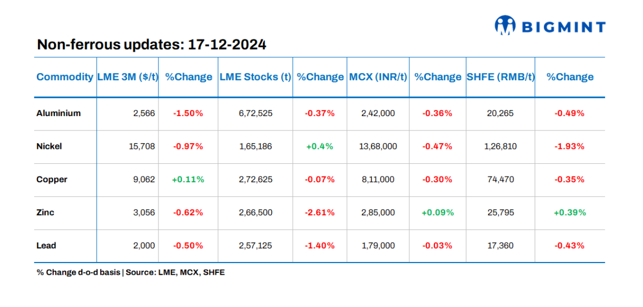 Base metals prices on the London Metal Exchange (LME) showed negative trends, except for copper, which increased by 0.11% d-o-d. Meanwhile, inventories at LME-registered warehouses witnessed outflows, with zinc stocks decreasing by 2.61% d-o-d.