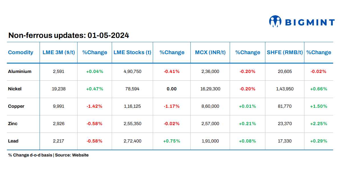Base metals prices on LME witnessed varied trends at yesterday’s closing with the highest drop seen in copper. Meanwhile, India’s domestic market also witnessed mixed trends aligned with the global market. US Fed likely to keep rates steady amid concerns over recent inflation data. Eurozone economy rebounded in Q1, Germany returned to growth, inflation steadied, bolstering ECB case for rate cuts.