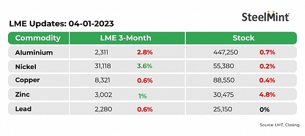 Base metals prices on all major exchanges showed mixed trends in the last closing session on 3 January 2023.
